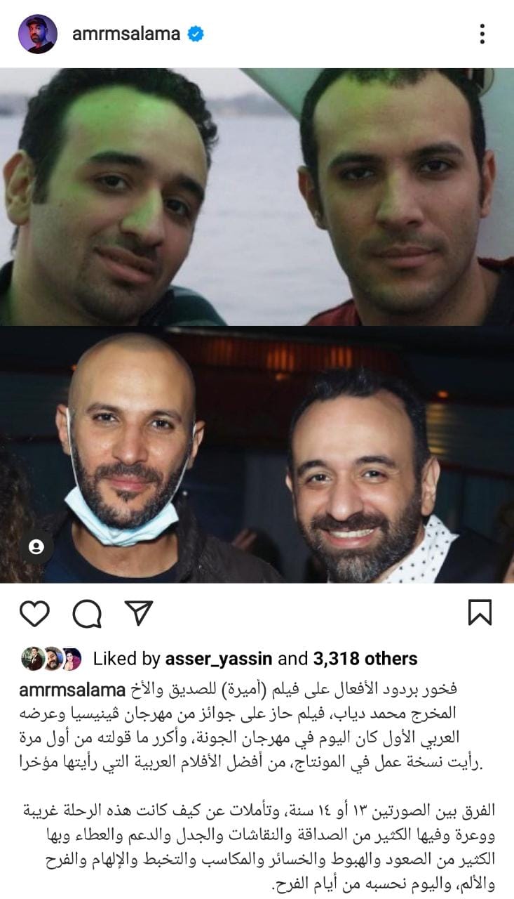 وأعرب المخرج عمرو سلامة عن فخره بصديقه المخرج محمد دياب، مخرج فيلم أميرة، من خلال نشر صورة تجمعهما ما بين الماضي والحاضر عبر صفحته الرسمية بموقع انستجرام أمس معلقًا عليها: فخور بردود الأفعال على فيلم أميرة للصديق والأخ والمخرج محمد دياب، وهو فيلم حاز على جوائز من مهرجان فينيسيا، وعرضه العربي الأول كان بمهرجان الجونة السينمائي، وأشاد المخرج عمرو سلامة بالفيلم، وتذكر رحلة الكفاح التي جمعته بصديقه المخرج محمد دياب، مختتمًا: اليوم نحسبه من أيام الفرح.