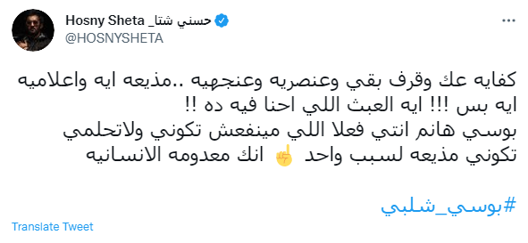 وكتب حسني شتا في منشور عبر حسابه الرسمي بموقع التغريدات تويتر: كفايه عك وقرف بقي وعنصريه وهمجية.. مذيعه إيه وإعلاميه إيه بس.. إيه العبث اللي إحنا فيه ده.