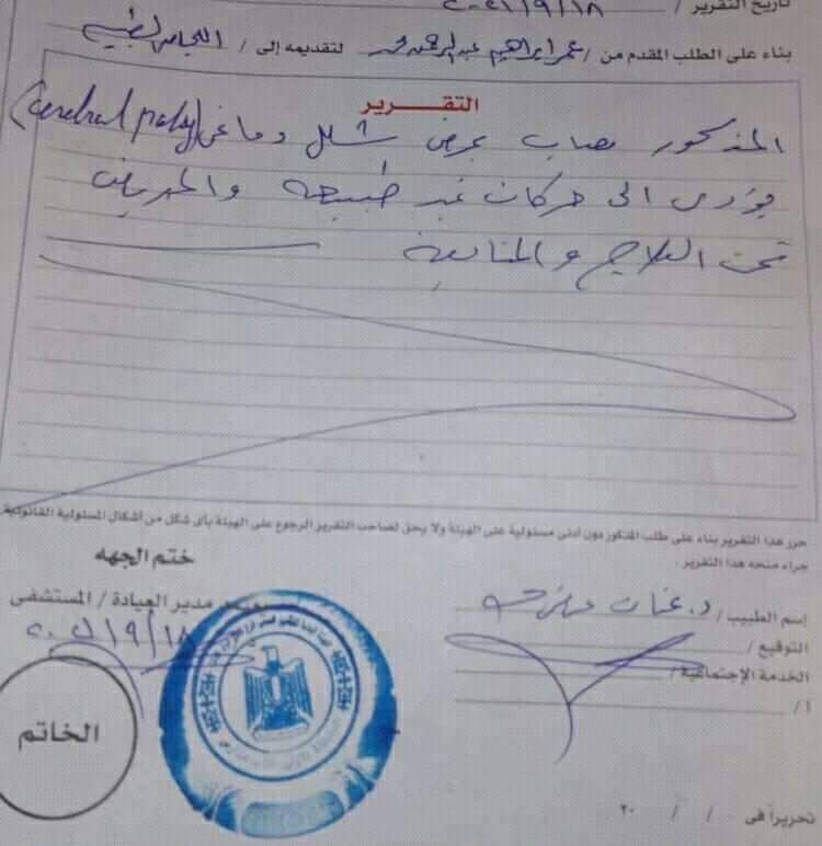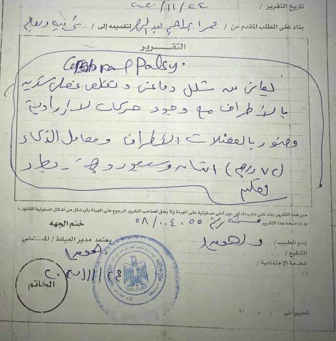 يقول إبراهيم، لـ القاهرة 24، إنه فور ولادته؛ أصيب بمرض الصفراء، وبسبب خطأ طبي؛ أصيب بضمور جزئي في المخ، وضعف وتقلص عضلي شديد بالأطراف، مع وجود حركات لا إرادية، وبعد العرض على عدد من المستشفيات؛ ازداد الوضع الصحي سوءًا بعد صرف 3 حقن بوتكس تلقاها، مما أدى لتفاقم حالته الصحية.