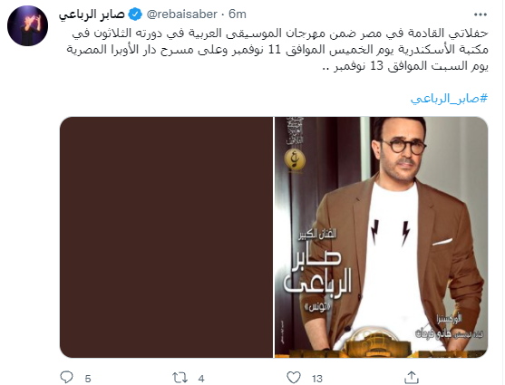 وأضاف صابر الرباعي في التغريدة، كاشفًا موعد ثاني حفل له في مصر قائلًا: وعلى مسرح دار الأوبر المصرية يوم السبت الموافق 13 نوفمبر.