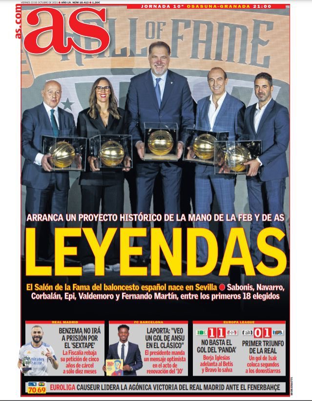تصدر العنوان لن يذهب بنزيما إلى السجن بسبب الابتزاز الجنسي غلاف صحيفة آس الإسبانية، وذلك عقب طلب المدعي العام أمس عقوبة قوية على النجم الفرنسي.