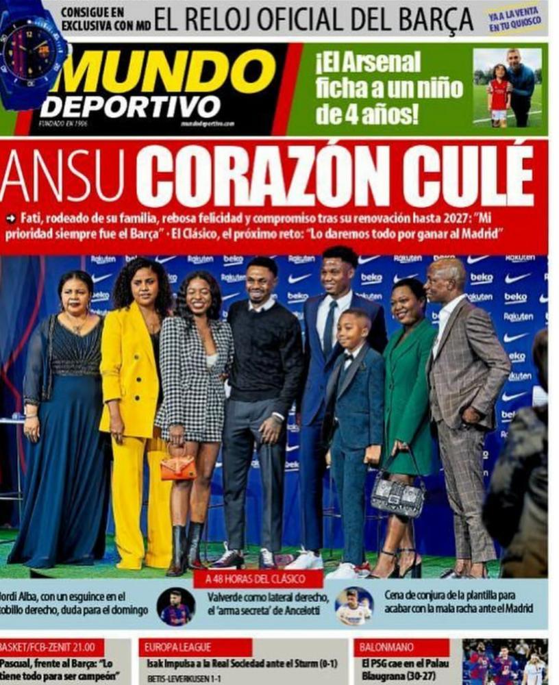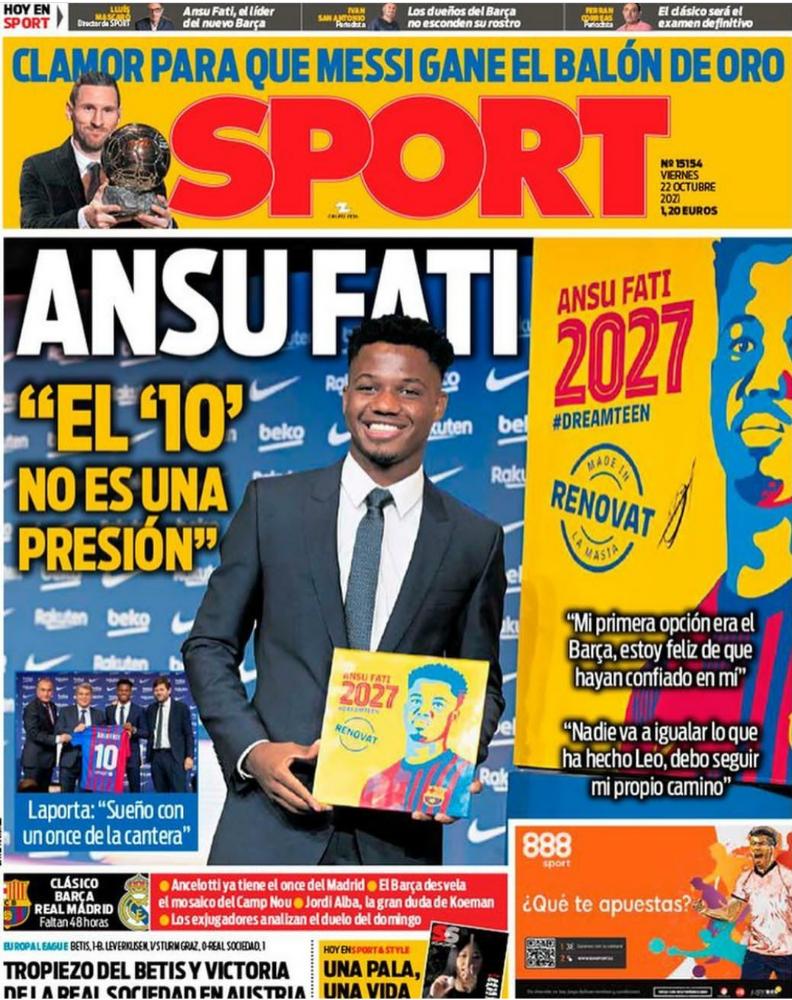 احتفلت الصحيفة الكتالونية بتجديد عقد أنسو فاتي مع برشلونة في إشارة بأنه خليفة ميسي، بجانب رصد تصريحاته في مؤتمر تجديد عقده رفقه خوان لابورتا رئيس النادي الكتالوني.