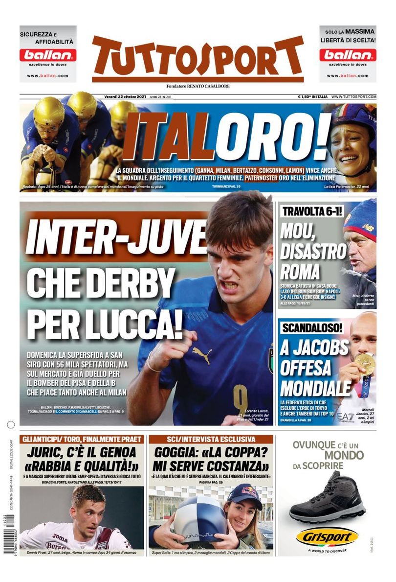 قالت صحيفة توتو سبورت الإيطالية في غلافها انتر - يوفنتوس، يا له من ديربي للوكا، حيث سيشهد يوم الأحد المواجهة في سان سيرو بحضور 56000 متفرج.