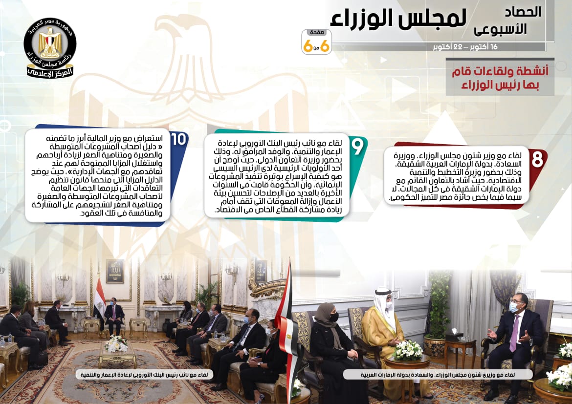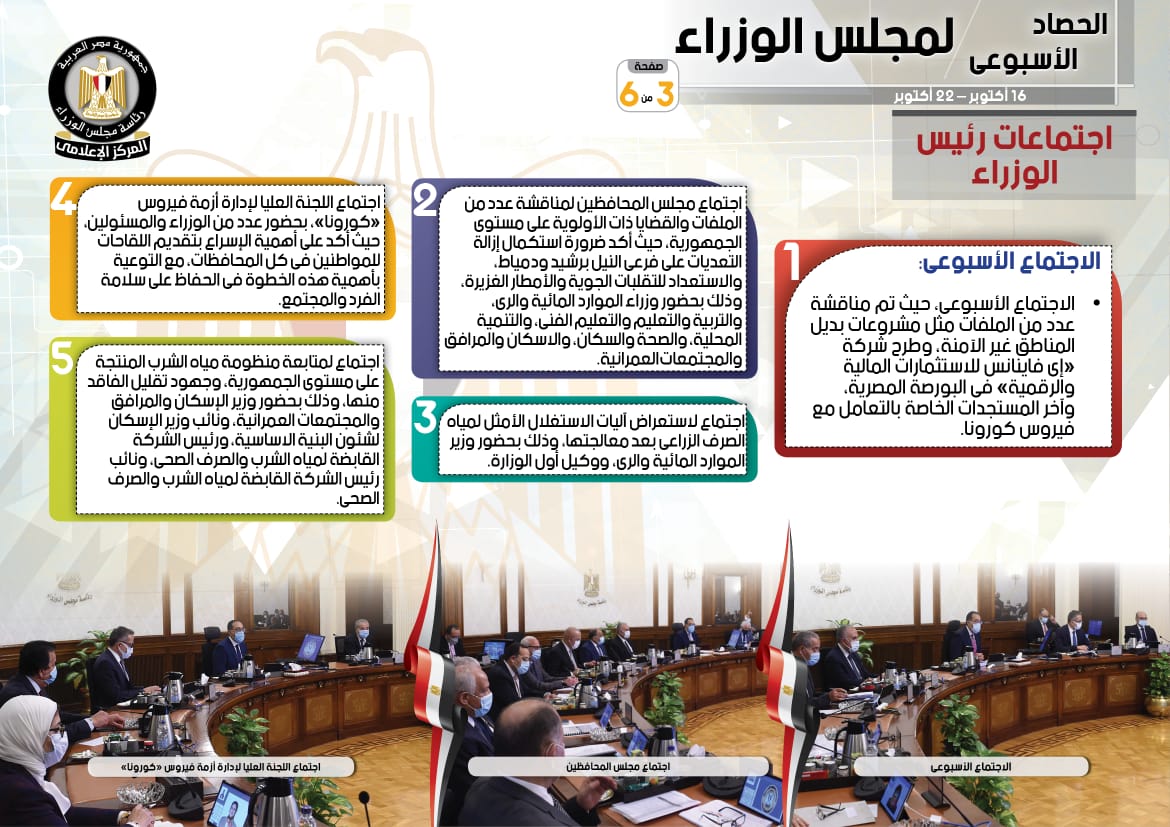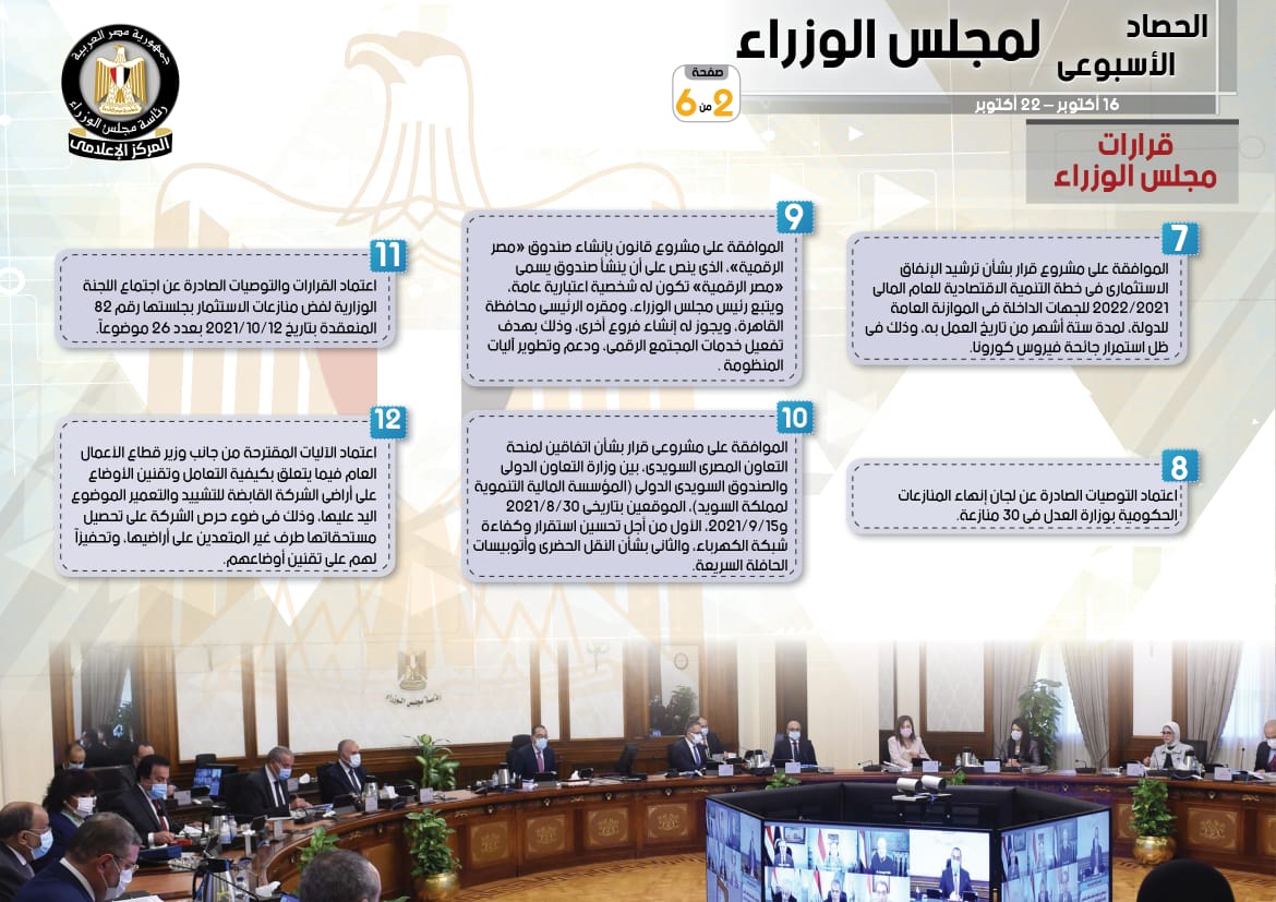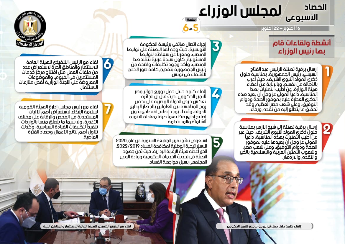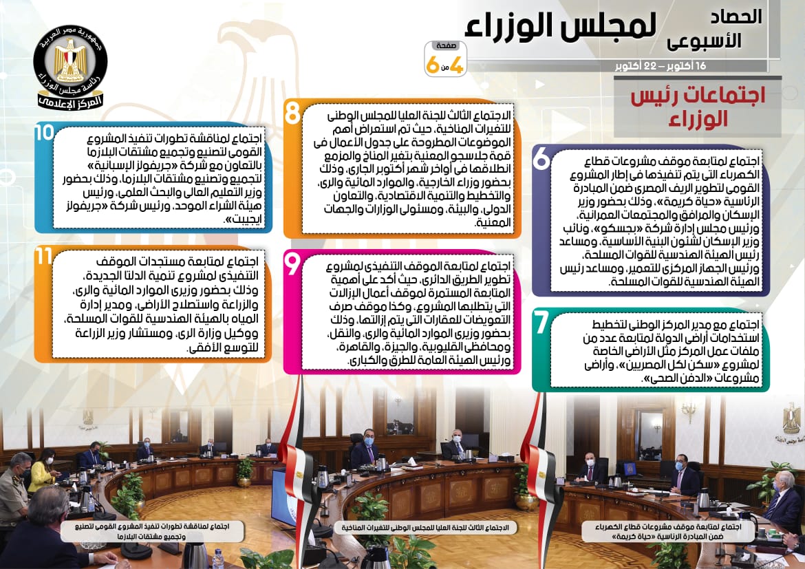 نشر المركز الإعلامي، لمجلس الوزراء تقريرا شمل إنفوجرافات سلط من خلالها الضوء على الحصاد الأسبوعي لمجلس الوزراء، وذلك خلال الفترة من 16 حتى 22 أكتوبر 2021، الذي تضمن الموافقة على عدد من القرارات، فضلا عن الاجتماعات واللقاءات التي عقدها الدكتور مصطفى مدبولي، رئيس مجلس الوزراء.