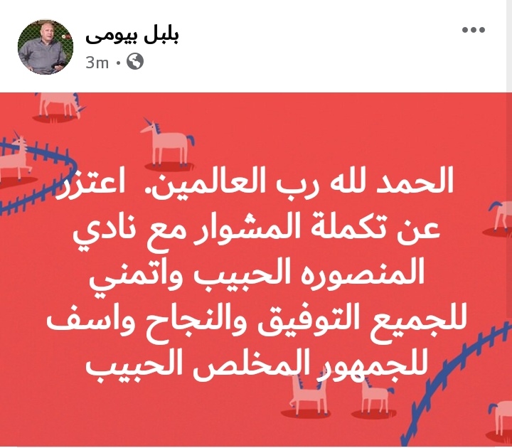 ونشر المدير الفني السابق لفريق المنصورة، عبر حسابه الشخصي على موقع التواصل الاجتماعي فيسبوك منشورًا، يعتذر فيه إلى جمهور ومتابعي الفريق البرتقالي عن عدم استمراره في قيادة الفريق خلال الفترة القادمة، متمنيًا التوفيق للفريق فيما هو قادم ولمجلس الإدارة السداد في اختيار مدير فني جديد.