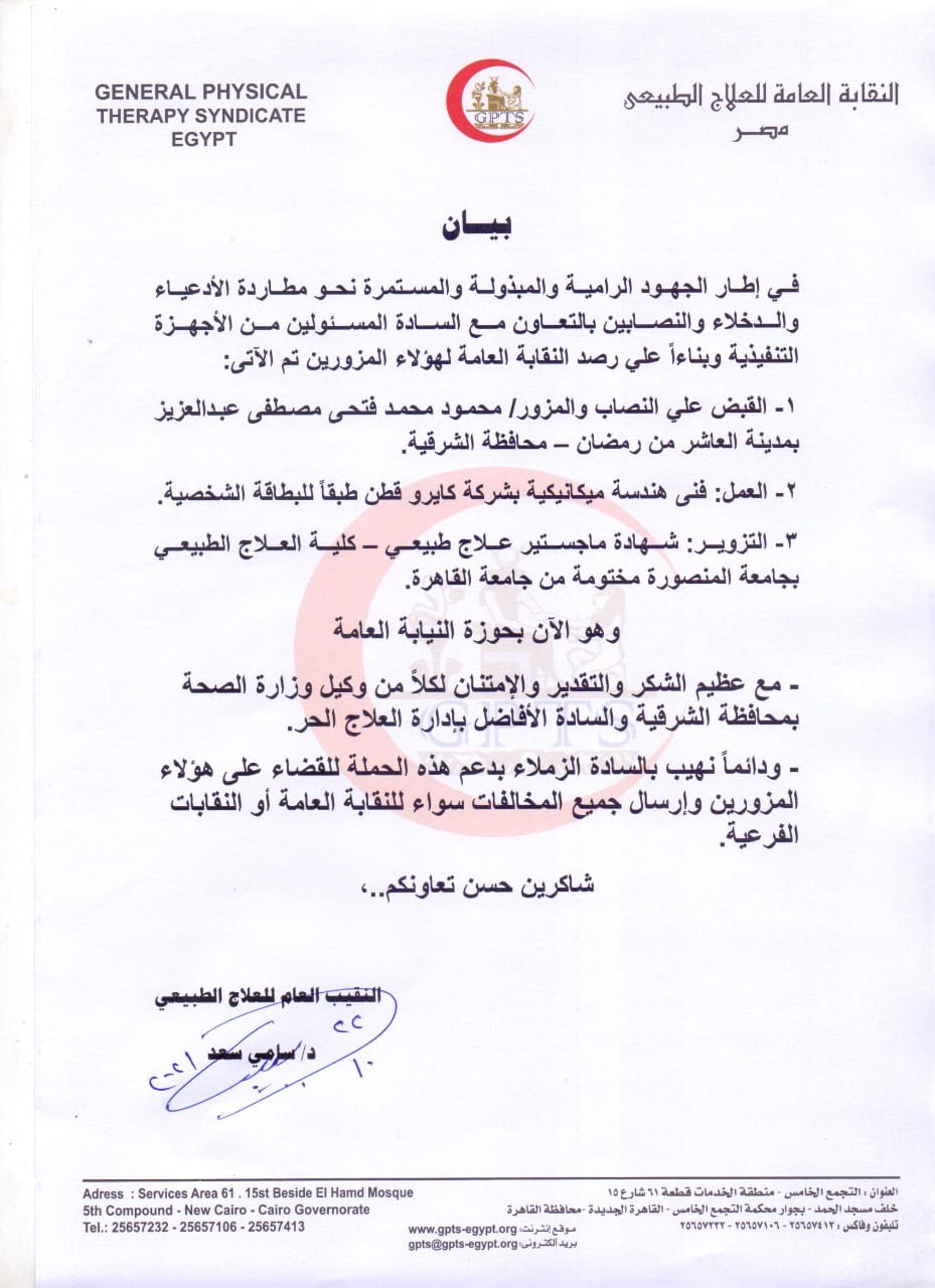 ويأتي ذلك في إطار الجهود الرامية والمبذولة والمستمرة نحو مطاردة الأدعياء والدخلاء والنصابين بالتعاون مع المسئولين من الأجهزة التنفيذية، الذي مكنت النقابة العامة للعلاج الطبيعي من رصد هؤلاء المزورين.