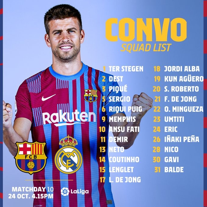 وضمت قائمة برشلونة لمواجهة ريال مدريد: تيرشتيجن - ديست - بيكيه - سيرجيو بوسكيتس - ريكي بويج - أنسو فاتي - ديباي - ديمير - نيتو - فيليب كوتينيو - لانجليت - فرينكي دي يونج - جوردي ألبا - كون أجويرو - سيرجي روبرتو - لوك دي يونج - مينجويزا - أومتيتي - بيينا - نيكو - جافي - إريك جارسيا - بالدي.