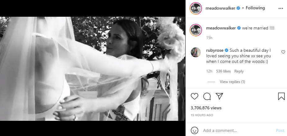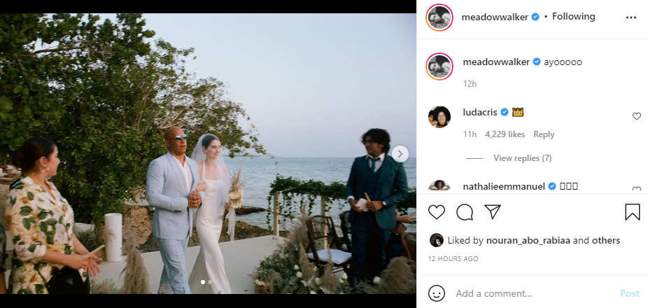 تزوجت ميدو ووكر، ابنة الفنان الراحل بول ووكر أمس، وشاركت متابعيها الصور والفيديوهات من حفل زفافها الذي حضره عدد كبير من الفنانين.