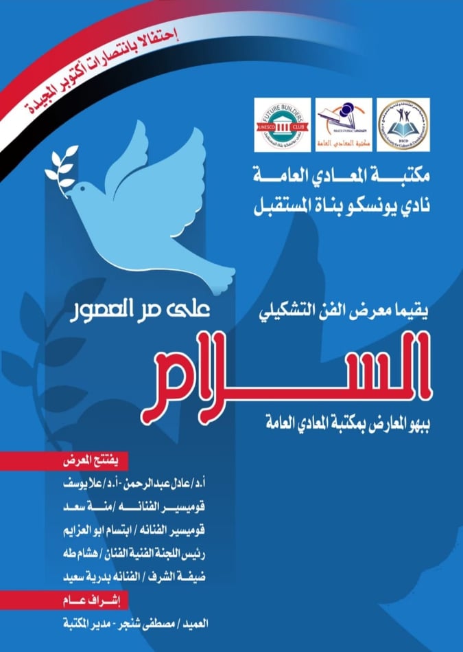 تقيم مكتبة المعادي العامة معرض الفن التشكيلي السلام على مر العصور، احتفالا بانتصارات أكتوبر المجيدة، تحت إشراف مصطفي شنجر مدير مكتبة المعادي وذلك في يوم 25 أكتوبر 2021 في تمام الساعة السادسة مساءً.