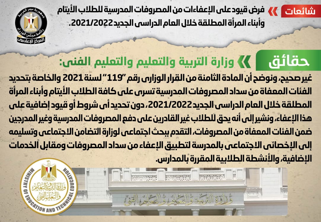 وتواصل المركز الإعلامي لمجلس الوزراء مع وزارة التربية والتعليم والتعليم الفني، والتي نفت تلك الأنباء، مُؤكدةً أنه لا صحة لفرض أي قيود على الإعفاءات من المصروفات المدرسية للطلاب الأيتام وأبناء المرأة المطلقة خلال العام الدراسي الجديد 2021/2022.