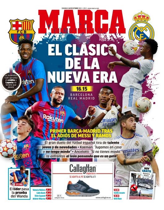تصدر العنوان، عصر الكلاسيكو الجديد، غلاف صحيفة ماركا الإسبانية، في وصف الكلاسيكو بأنه أول لقاء لبرشلونة ومدريد بعد وداع ميسي وراموس.