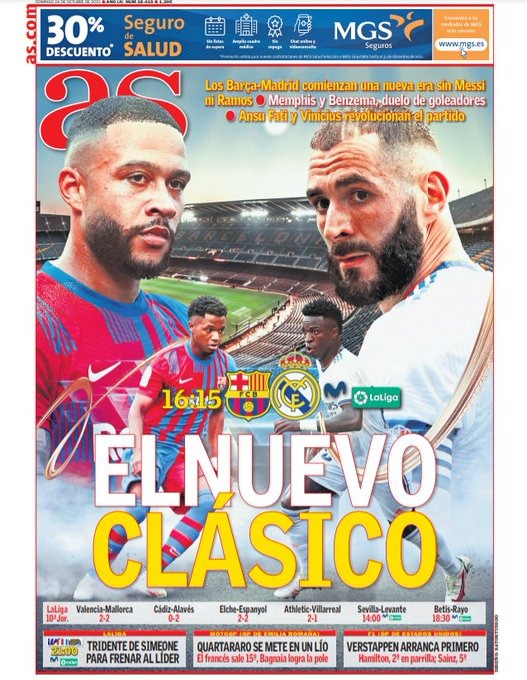 عنونت صحيفة آس الإسبانية في صفحة غلافها بـ الكلاسيكو الجديد، حيث تشير الصحيفة أن الكلاسيكو هذا يمثل حقبة جديدة دون ثنائي القادة ميسي وراموس، في صراع بنزيما وديباي على الهدافين.