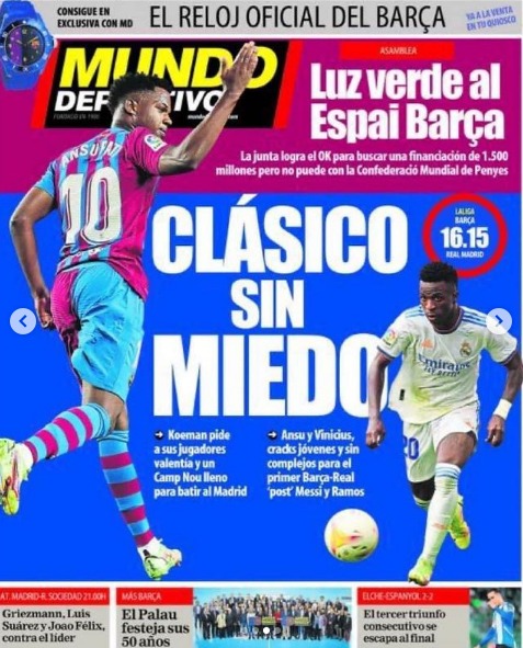 تصدر العنوان، كلاسيكو دون خوف، غلاف صحيفة موندو ديبورتيفو الإسبانية، وذلك في إشارة منها أنه سيكون لقاء فريد من نوعه يجمع الثنائي الشاب في مواجهة نارية بين فينيسيوس جونيور وأنسو فاتي.