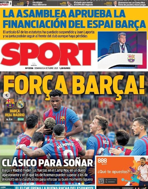 دعمت الصحيفة الكتالونية نادي برشلونة في صفحة غلافها، وذلك تحت عنوان، فورسا بارسا، مع رصد بعض النقاط المميزة لكلاسيكو العام الحالي أهمها غياب ميسي عن المشاركة به.