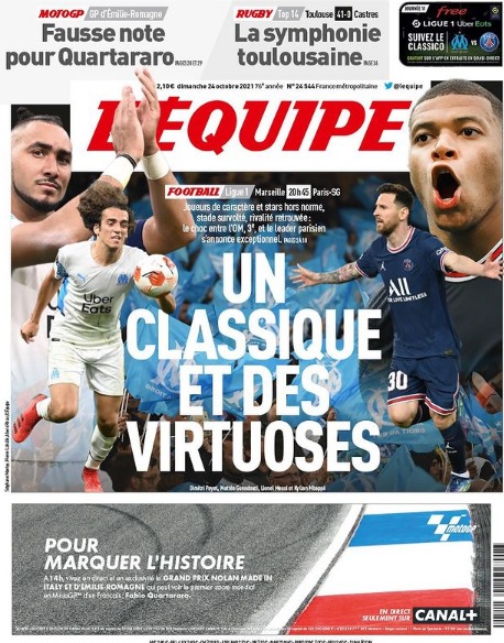 عنونت ليكيب في صفحة غلافها بـ كلاسيكو بالفطرة، في حديث عن مواجهة فريق باريس سان جيرمان ضد نظيره مارسيليا في قمة منافسات الجولة الحادية عشر من الدوري الفرنسي.