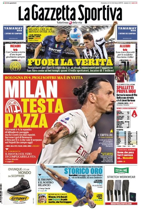 سلطت صحيفة لا جازيتا الضوء على صدارة ميلان للدوري الإيطالي بعد فوز الأمس، وذلك تحت عنوان ميلان، جنون الصدارة.