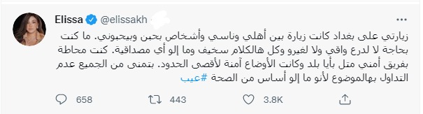 وغردت إليسا، عبر حسابها الشخصي بموقع التدوينات القصيرة تويتر: زيارتي على بغداد، كانت زيارة بين أهلي وناسي، وأشخاص بحبهم وبيحبوني، ما كنت بحاجة لا لدرع واقي، ولا لغيره، وكل هالكلام سخيف، وما إله أي مصداقية.