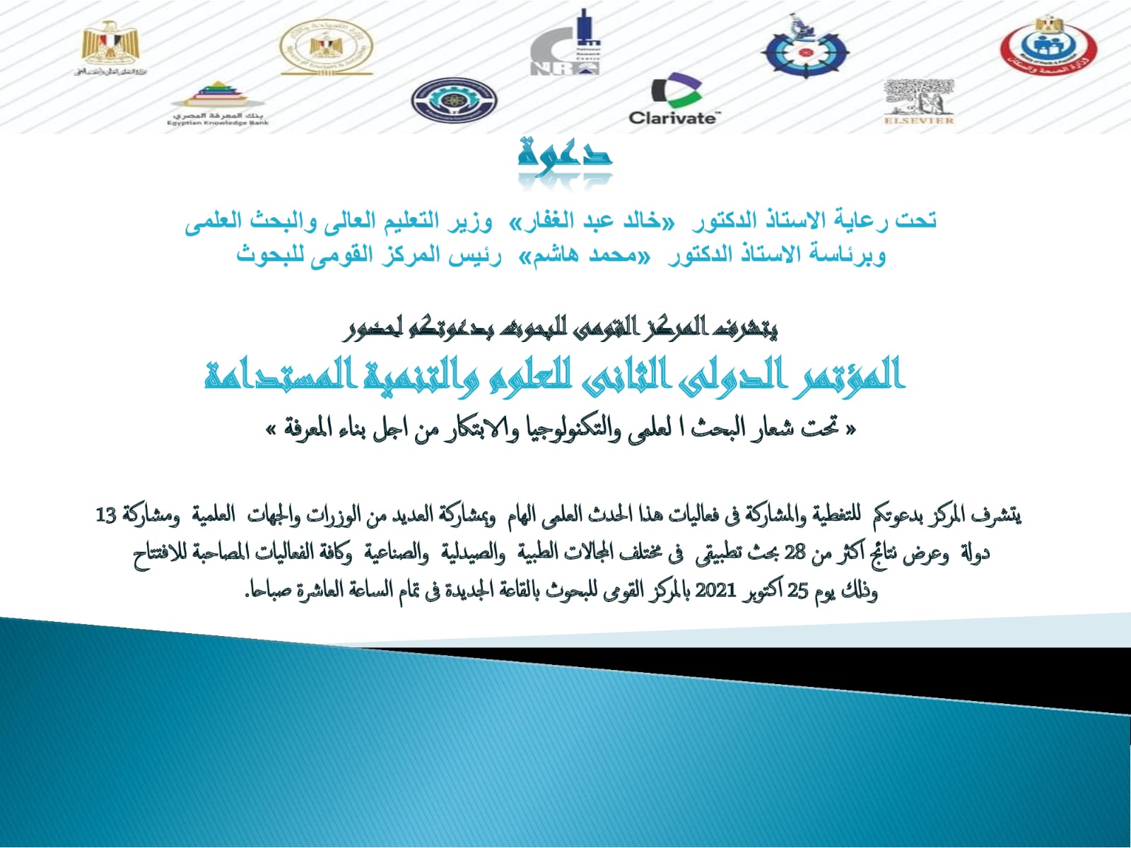 يقام اليوم تحت رعاية الدكتور «خالد عبد الغفار» وزير التعليم العالي والبحث العلمي والتكنولوجيا وبرئاسة الأستاذ الدكتور «محمد هاشم» رئيس المركز القومي للبحوث المؤتمر الدولي الثاني للعلوم والتنمية المستدامة. ومن المقرر أن يحمل المؤتمر شعار البحث العلمي والتكنولوجيا والابتكار من أجل بناء المعرفة، وذلك بمشاركة العديد من الوزارات والجهات العلمية ومشاركة 13 دولة لعرض نتائج أكثر من 28 بحث تطبيقي في مختلف المجالات الطبية والصيدلية، وسيتم افتتاح المؤتمر غدًا في تمام العاشرة صباحًا بالمركز القومي للبحوث.