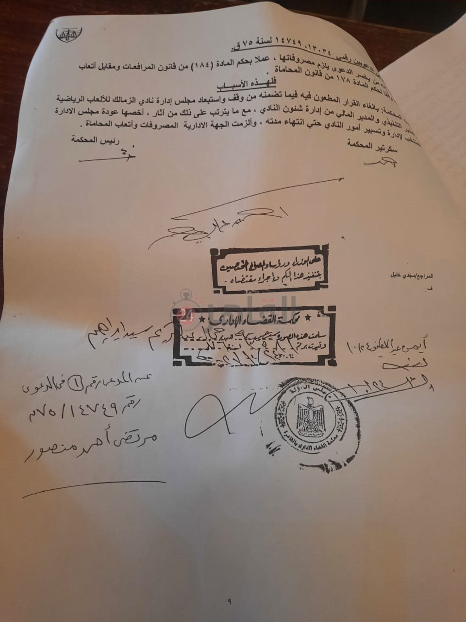 وقضت محكمة القضاء الإداري بإلغاء قرار المطعون فيه فيما تضمنه من وقف واستبعاد مجلس إدارة نادي الزمالك للألعاب الرياضية والمدير التنفيذي والمدير المالي من إدارة شؤون النادي مع ما يترتب على ذلك من آثار أخصها عودة مجلس الإدارة المنتخب لإدارة وتسيير أمور النادي حتى انتهاء مدته وألزمت الجهة الإدارية المصروفات وأتعاب المحاماة.