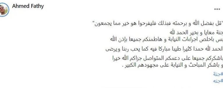 وكان والد جنة كتب عبر فيسبوك في وقت سابق: قل بفضل الله وبرحمته فبذلك فليفرحوا هو خير مما يجمعون.. جنة معايا وبخير الحمد لله.. بس بخلص إجراءات النيابة وهطمنكم جميعا بإذن الله.. الحمد لله حمدا كثيرا طيبا مباركا فيه كما يحب ربنا ويرضى.. بشكركم جميعا على دعمكم المتواصل جزاكم الله خيرا.. وبشكر المباحث والنيابة على مجهودهم الكبير.