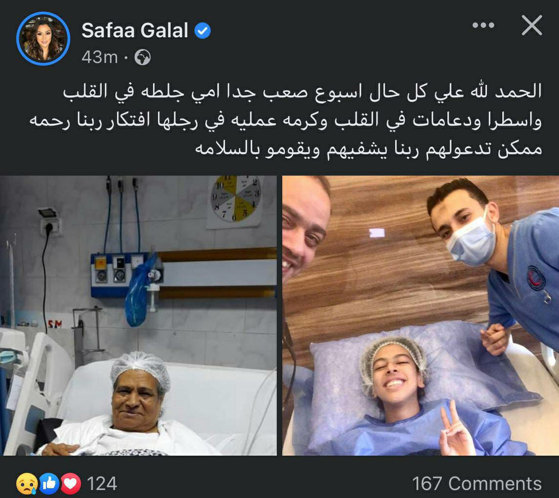 وكتبت صفاء جلال منشورًا، عبر حسابها الشخصي بموقع التواصل الاجتماعي فيس بوك، قائلة: الحمد لله على كل حال، أسبوع صعب جدًا أمي جلطة في القلب وقسطرة ودعامات في القلب، وكرمه عملية في رجلها، افتكار ربنا رحمه، ممكن تدعولهم ربنا يشفيهم ويقومهم بالسلامة.