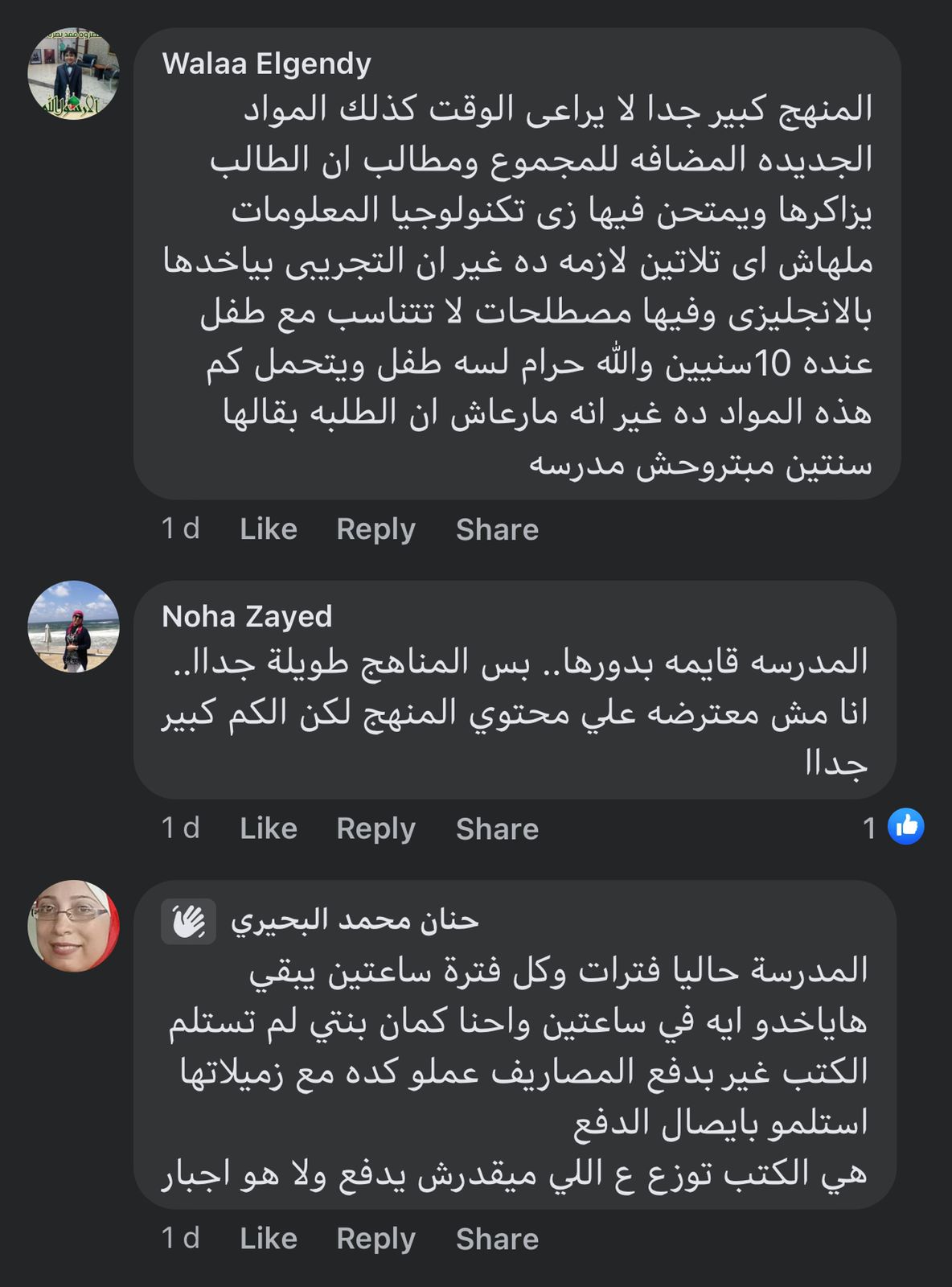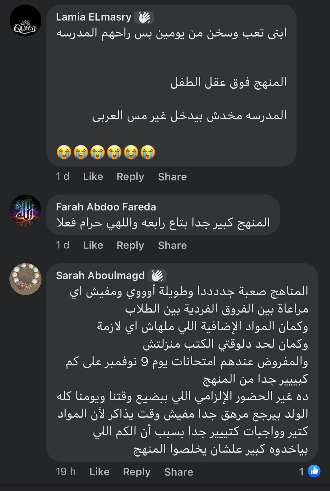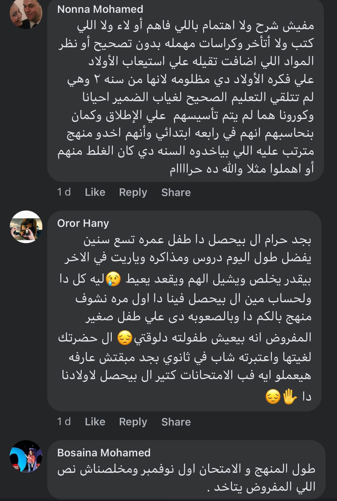من جانبها علقت حور هاني، ولية أمر أخرى، قائلة: بجد حرام اللي بيحصل دا طفل عمره تسع سنين يفضل طول اليوم دروس ومذاكرة، ويا ريت في الآخر بيقدر يخلص ويشيل الهم ويقعد يعيط، أول مره نشوف منهج بالكم دا وبالصعوبة دي على طفل صغير، المفروض إنه بيعيش طفولته دلوقتي.
