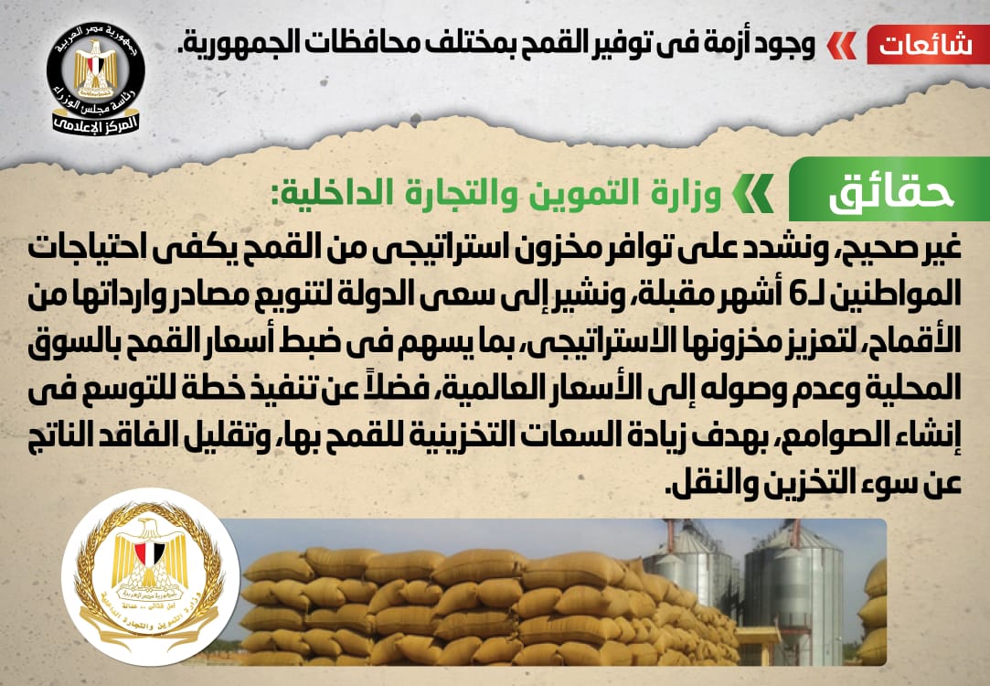 الوزارة أكدت أنه لا صحة لوجود أزمة في توفير القمح بأي من محافظات الجمهورية، مُشددةً على توفر مخزون استراتيجي من القمح، يكفي احتياجات المواطنين لـ 6 أشهر مقبلة، مُشيرةً إلى سعي الدولة لتنويع مصادر وارداتها من الأقماح، لتعزيز مخزونها الاستراتيجي، بما يسهم في ضبط أسعار القمح بالسوق المحلية، وعدم وصوله إلى الأسعار العالمية، فضلًا عن تنفيذ خطة للتوسع في إنشاء الصوامع، بهدف زيادة السعات التخزينية للقمح بها، وتقليل الفاقد الناتج عن سوء التخزين والنقل.