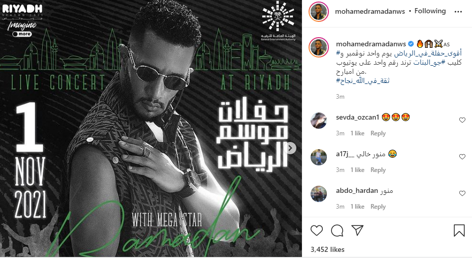 وشارك محمد رومضان جمهوره ببوستر الحفل، عبر حسابه الشخصي بموقع تبادل الصور والفيديوهات انستجرام، قائلًا: أقوى حفلة في الرياض، يوم واحد نوفمبر.. وكليب جو البنات تريند رقم واحد من امبارح، ثقة في الله نجاح.