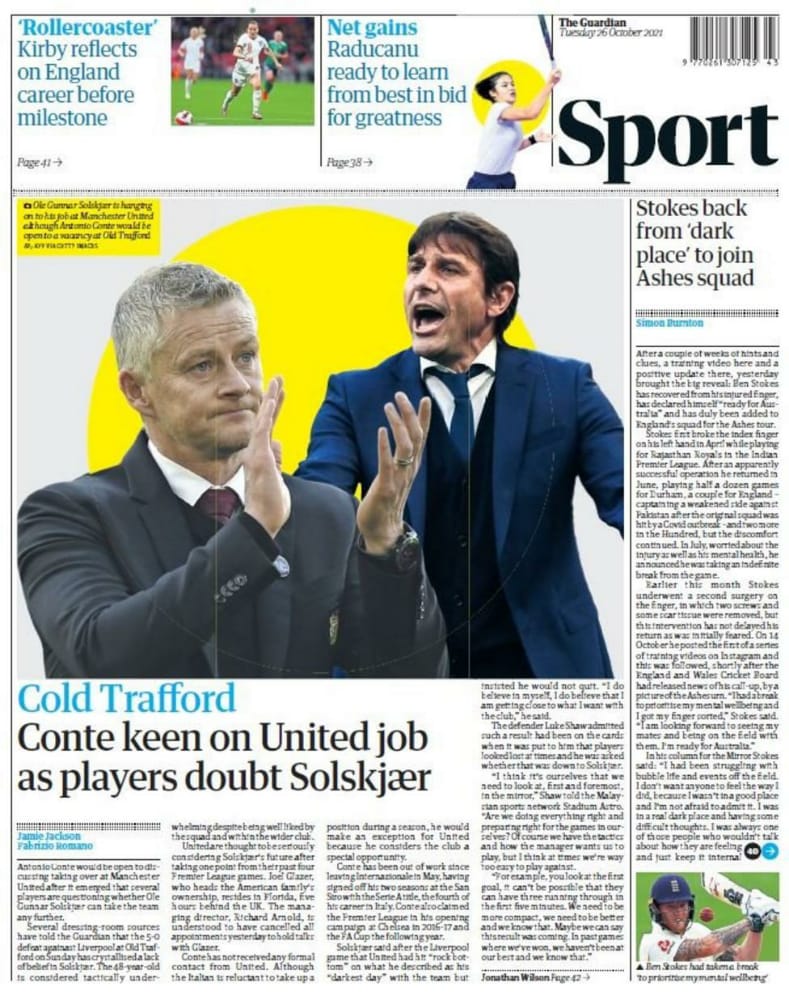 عنونت صحيفة جارديان باقتراب إقالة سولشاير مع إشارة أن كونتي هو المرشح الأقرب بعد التواصل معه من جانب الإدارة وتأكيد ترحيبه بقيادة الشياطين.