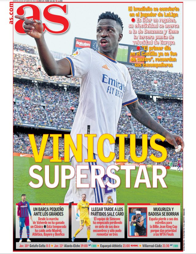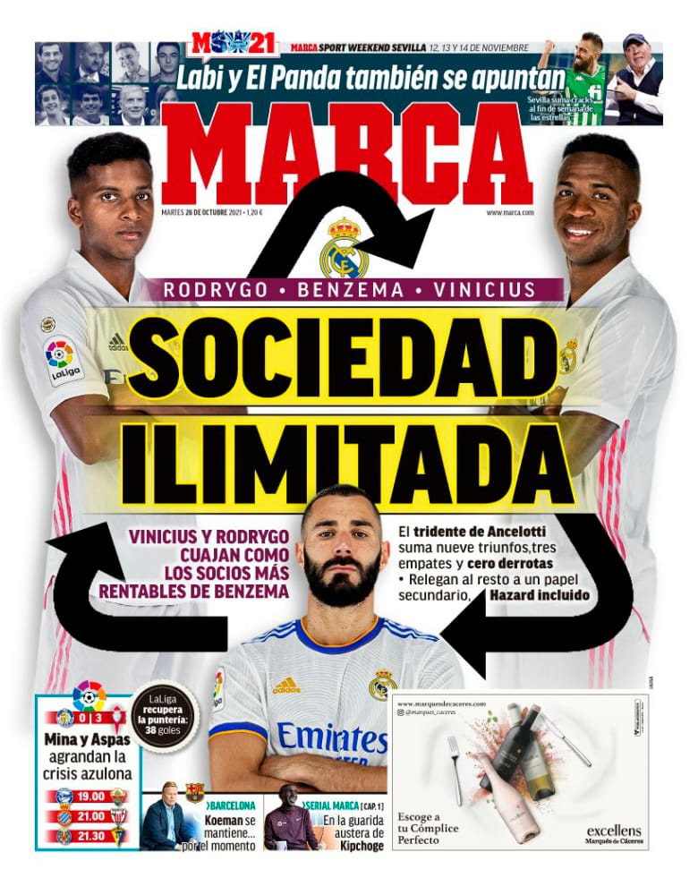 عنونت صحيفة ماركا الإسبانية في غلافها بالعنوان: لم يخسر ثلاثي بنزيما وفينيسيوس ورودريجو أي مباراة معًا: 9 انتصارات و3 تعادلات.