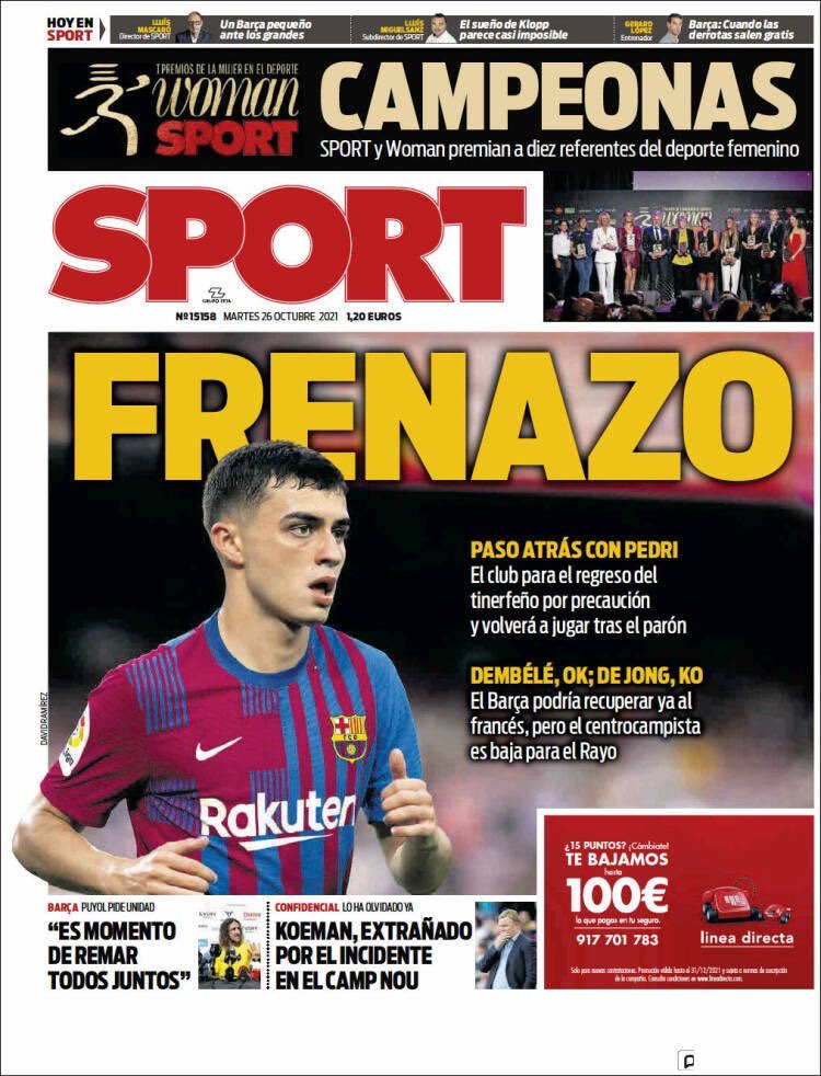 تصدر بيدري جونزاليس نجم فريق برشلونة غلاف صحيفة سبورت الإسبانية عقب إصابته، وذلك تحت عنوان: خطوة للخلف من بيدري.. اللاعب لن يعود للعب مع برشلونة إلا بعد التوقف الدولي.