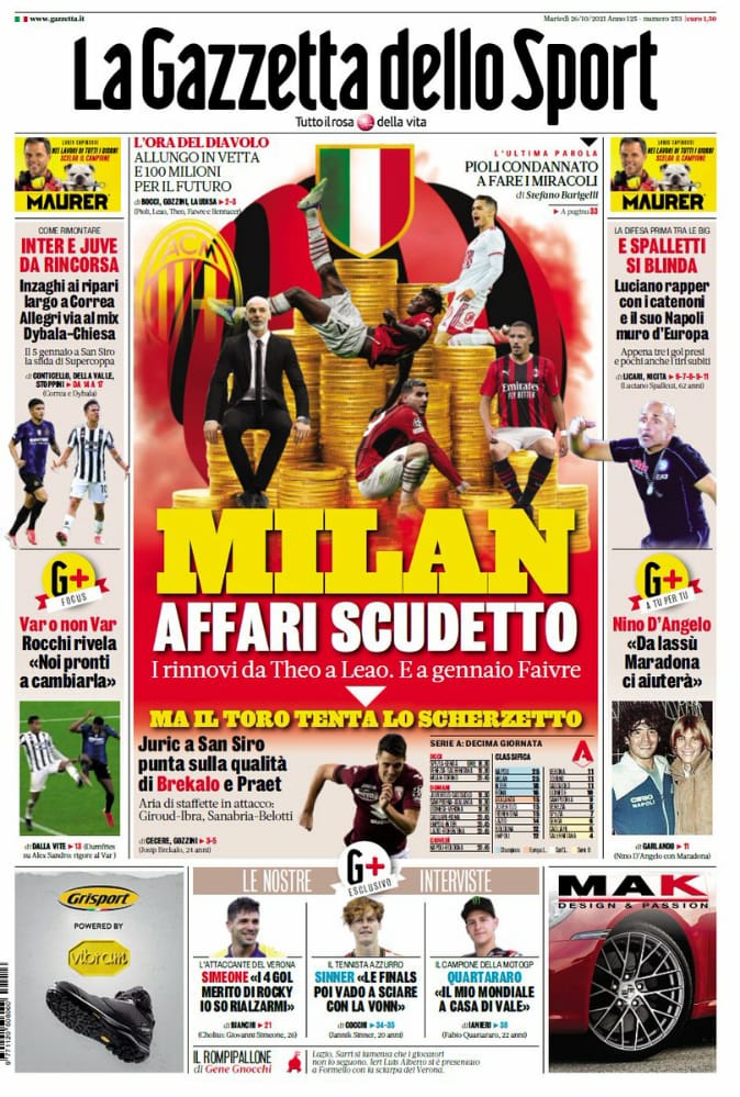 عنونت صحيفة لا جازيتا ديللو سبورت بعنوان: ميلان، صفقات الاسكوديتو.. تمديد العقود، من ثيو إلى لياو وفي يناير فايفري.