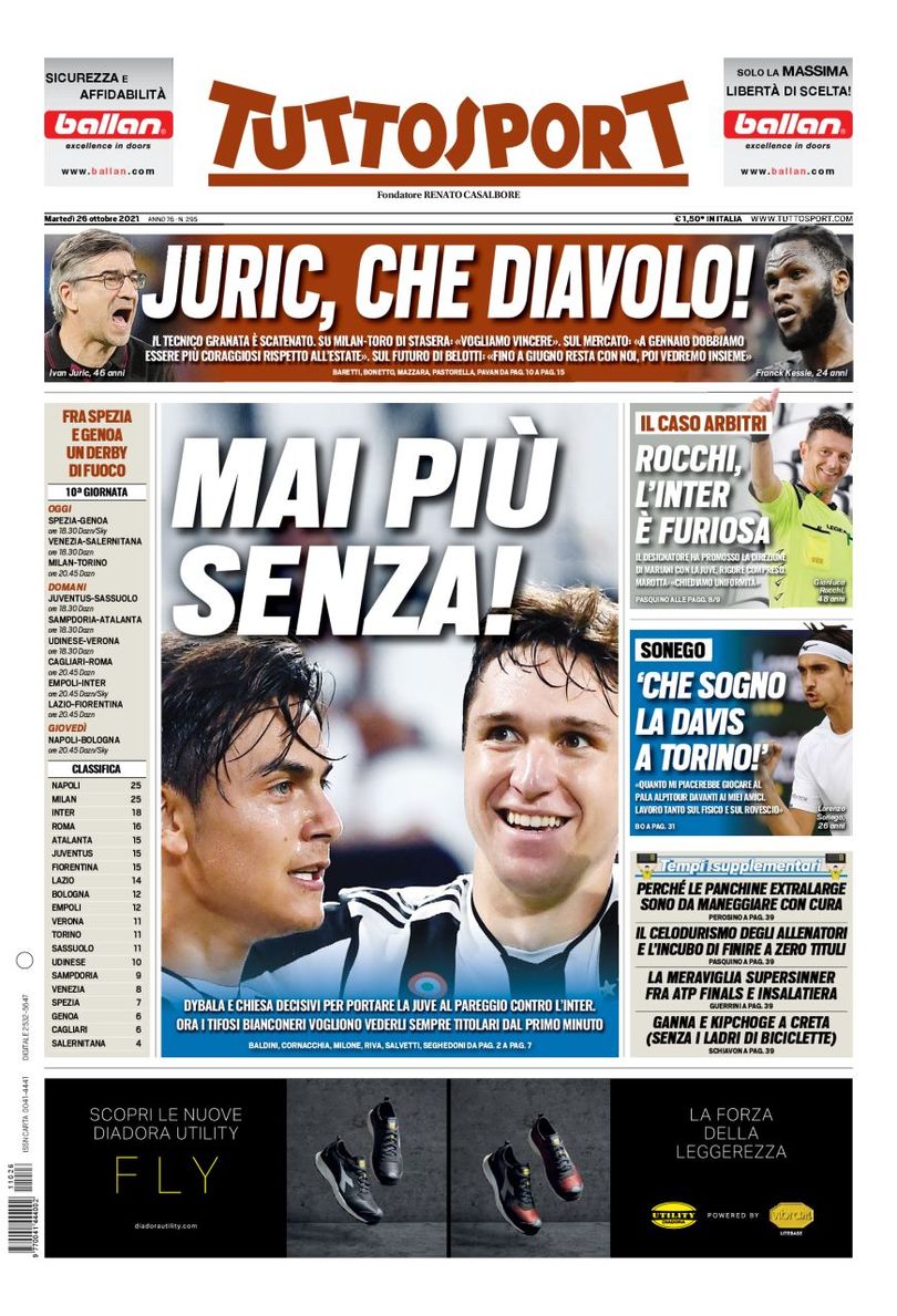 سلطت صحيفة توتو سبورت الإيطالية الضوء على أهمية كييزا وديبالا مع فريق يوفنتوس، تحت عنوان: لا تبدأ مرة أخرى بدونهم! ديبالا وكييزا حاسمان في قيادة يوفنتوس نحو التعادل مع إنتر.