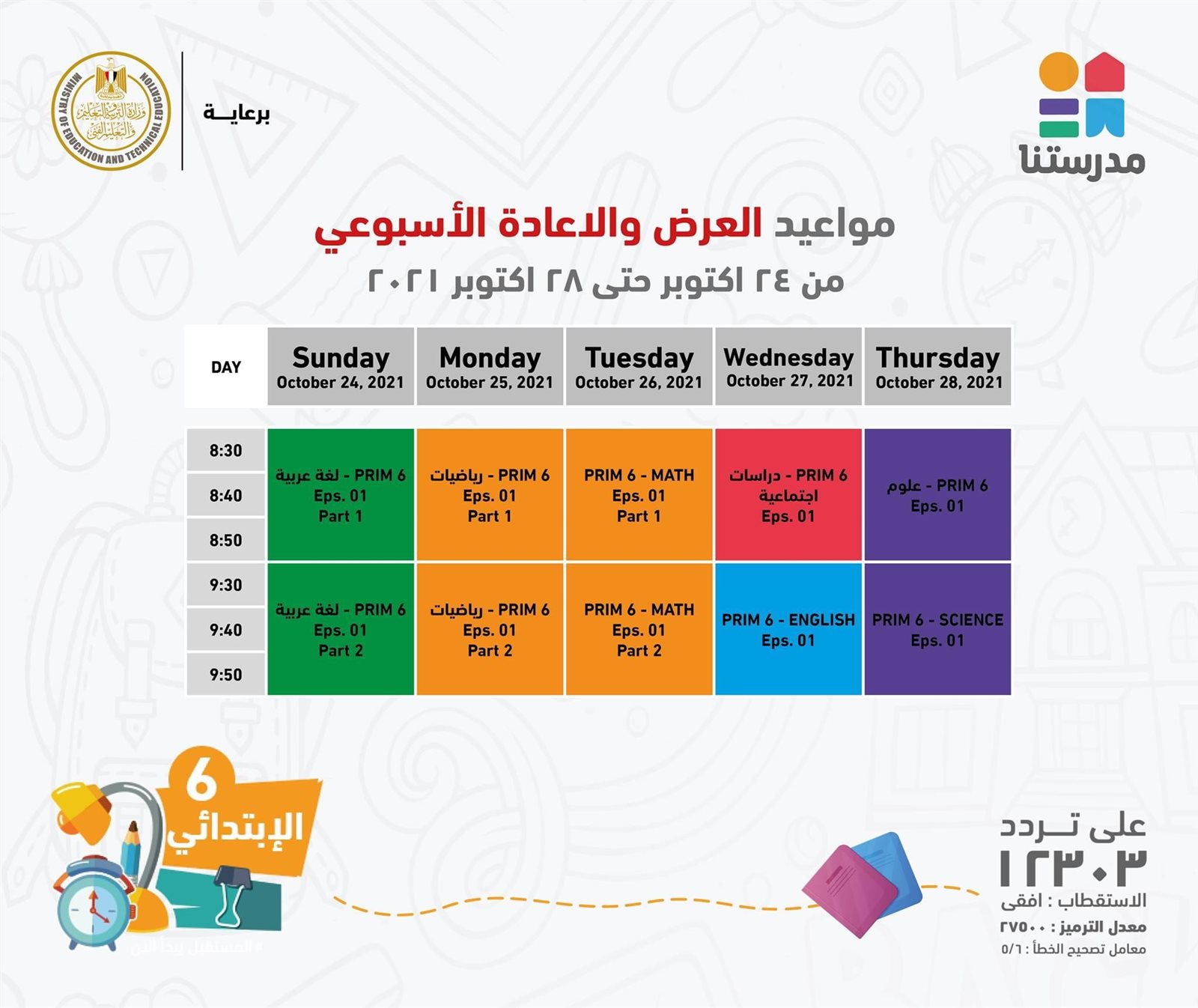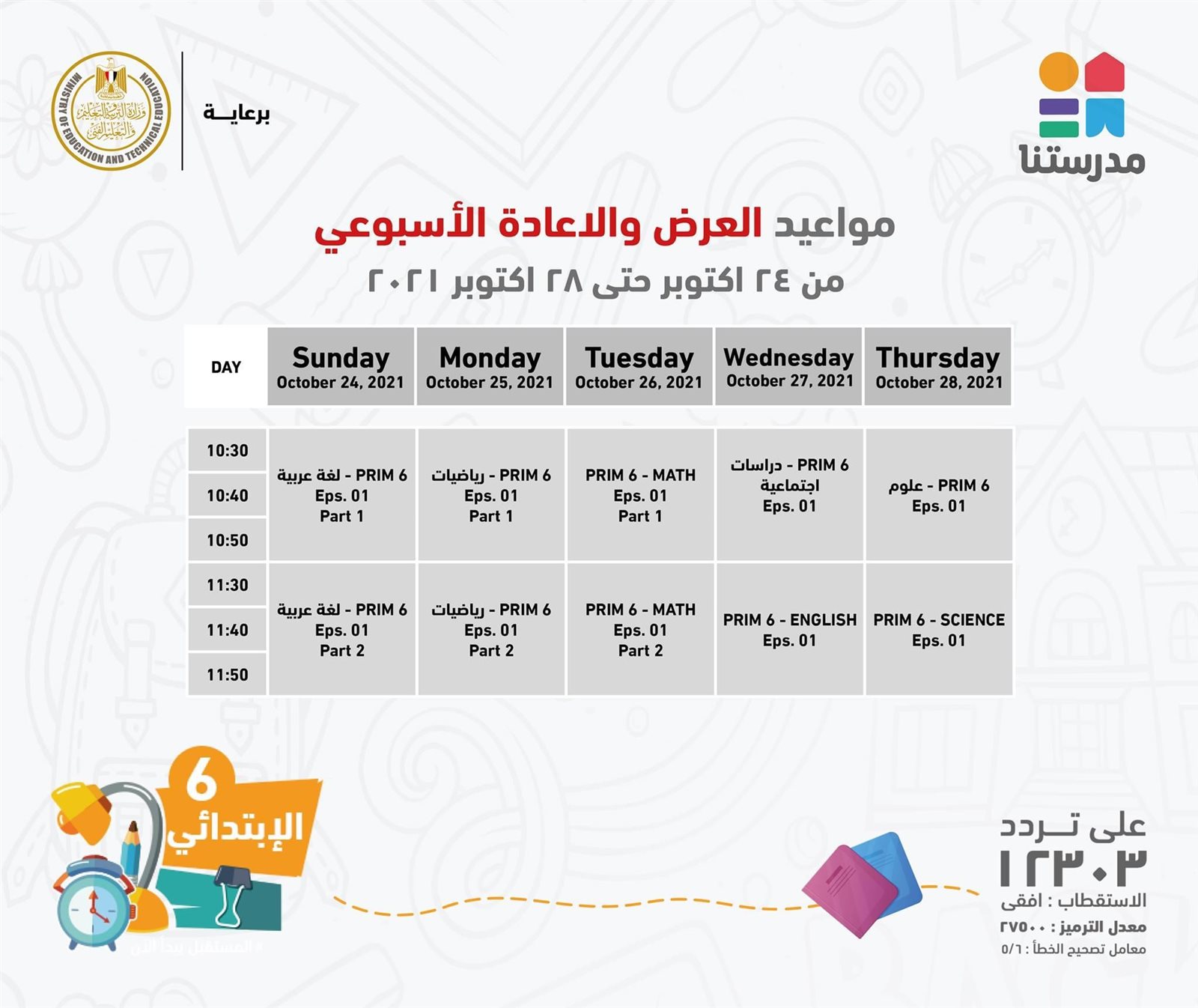 ونشرت الصفحة الرسمية لقناة مدرستنا تفاصيل مواعيد بث واعادة للبرامج للصف السادس الابتدائي، حيث تستهدف هذا العام تشجيع الطلاب على التركيز على نواتج التعلم والاعتماد على حل النماذج والاسئلة الاسترشادية بدلا من الحفظ والتلقين.