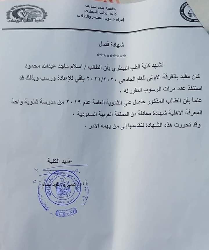 وقال الطالب إسلام مهران، لـ القاهرة 24، إنه التحق بكلية الطب البيطري جامعة بني سويف بعد حصوله على 98.5% في الثانوية العامة، والتحق بكلية العلاج الطبيعي الخاصة لمدة ترم واحد، وهو لا يزال مقيدا بكلية الطب البيطري.