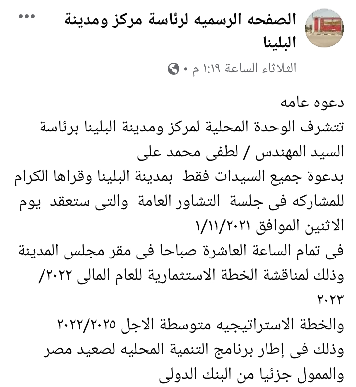وجاء في مضمون الدعوة التي تم نشرها: تتشرف الوحدة المحلية لمركز ومدينة البلينا، برئاسة السيد المهندس لطفى محمد علي، بدعوة جميع السيدات فقط، بمدينة البلينا وقراها الكرام، للمشاركة فى جلسة التشاور العامة، والتي ستعقد يوم الاثنين الموافق 1/11/2021 فى تمام الساعة العاشرة صباحا فى مقر مجلس المدينة وذلك لمناقشة الخطة الاستثمارية للعام المالي 2022/2023 والخطة الاستراتيجية متوسطة الأجل 2022/2025 وذلك فى إطار برنامج التنمية المحلية لصعيد مصر والممول جزئيا من البنك الدولي.