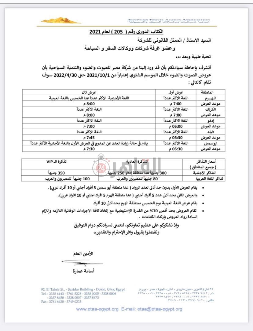 وحصل القاهرة 24 على نسخة من الخطاب الموجه من شركة عروض الصوت والضوء إلى غرفة شركات السياحة كالتالي.