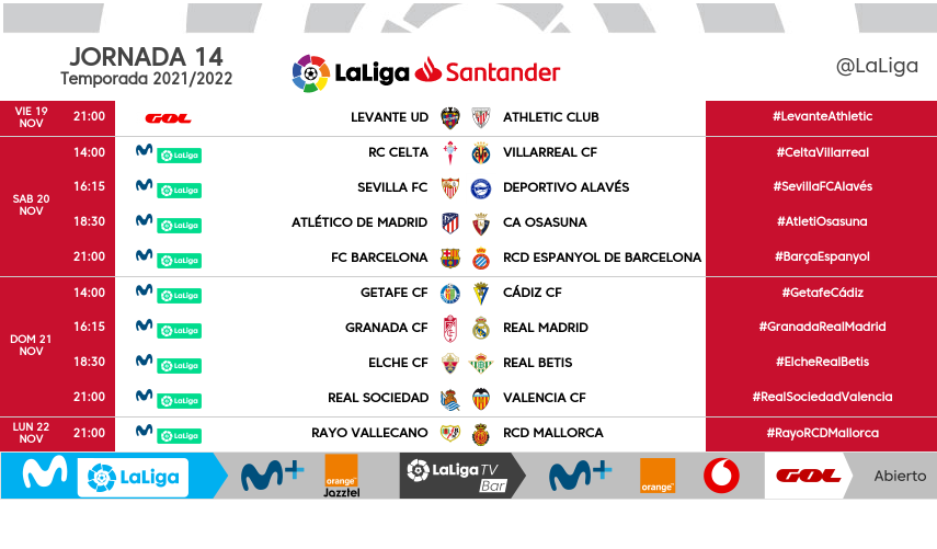 أعلنت رابطة الدوري الإسباني عبر حسابها الرسمي على موقع التواصل الاجتماعي تويتر، مواعيد منافسات الجولة الرابعة عشر بالدوري الإسباني.