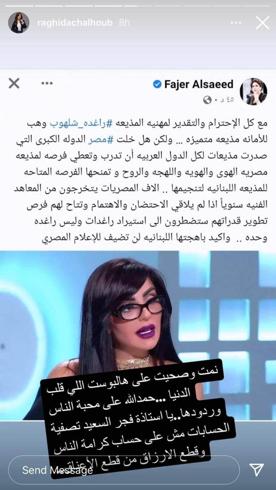 وعلقت راغدة شلهوب على هجوم فجر السعيد، عبر ستوري لها على حسابها الشخصي بموقع تبادل الصور والفيديوهات القصيرة انستجرام، حيث قالت: نمت وصحيت على هالبوست اللي قالب الدنيا، حمدا لله على محبة الناس وردودها.. يا أستاذة فجر السعيد تصفية الحسابات ليست على حساب كرامة الناس، قطع الأرزاق من قطع الأعناق.