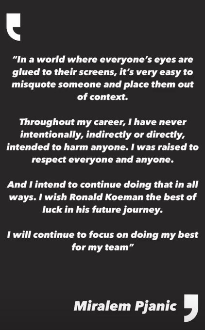 وقال بيانيتش عبر حساباته بمواقع التواصل الاجتماعي، عقب علمه بقرار إقالة كومان من تدريب برشلونة: لم أقصد أبدًا بشكل غير مباشر أو مباشر إيذاء أي شخص، لدي احترام كبير للجميع، أتمنى لرونالد كومان كل التوفيق في رحلته المستقبلية، سأستمر في التركيز على بذل قصارى جهدي مع فريقي.