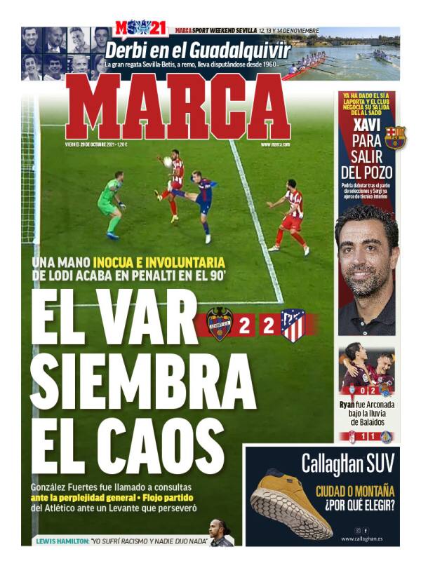 عنونت صحيفة ماركا الإسبانية في غلافها اليوم الجمعة بالعنوان "تقتية الفيديو تسببت في إحداث الدمار"، وذلك عقب إثارة الجدل في مباراة أتلتيكو مدريد وليفانتي وسط غضب من دييجو سيميوني.