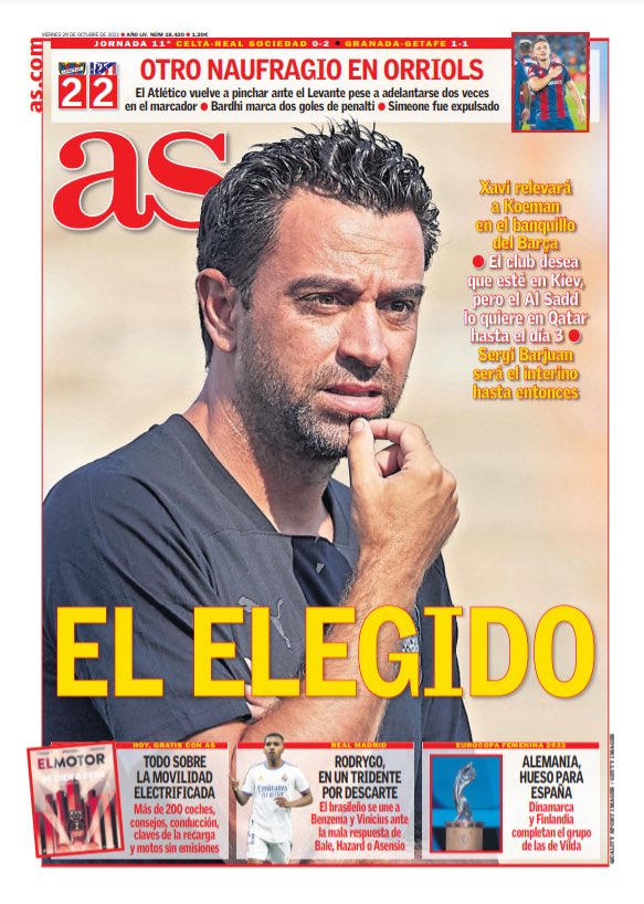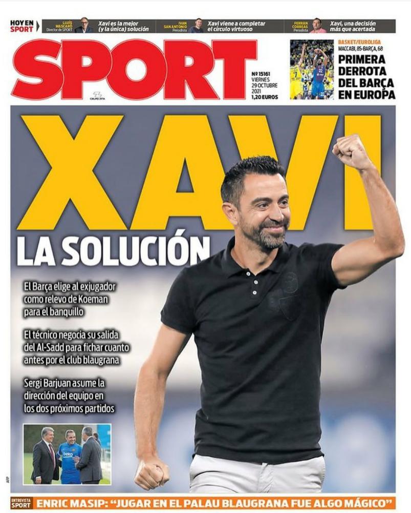 تصدر المدرب تشافي هيرنانديز غلاف صحيفة آس الإسبانية تحت عنوان "الاختيار"، في إشارة بأن لابورتا حسم قراره واختار بالفعل تشافي ليكون خليفة كومان.