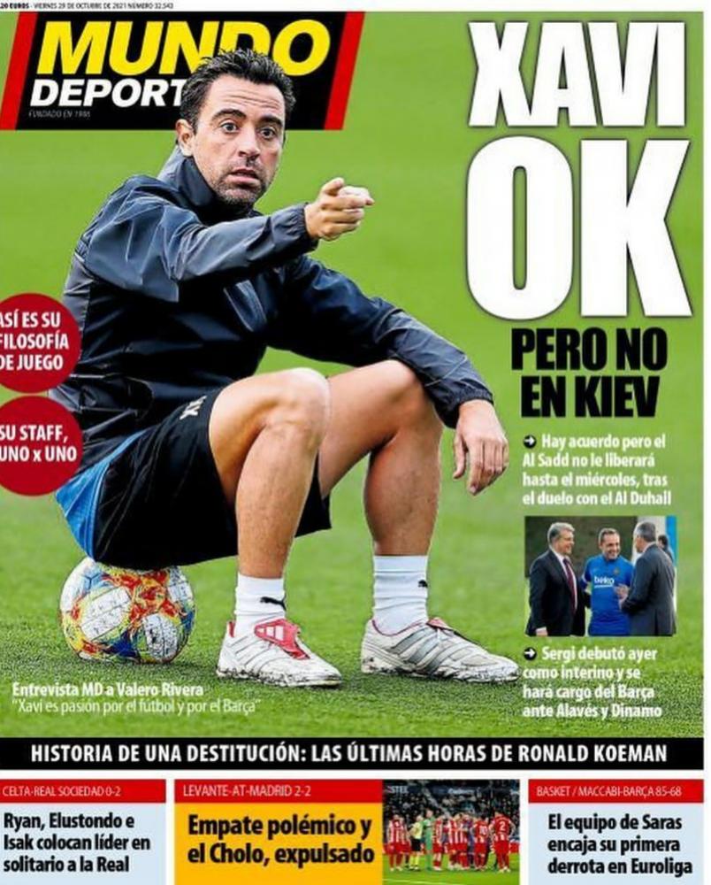 عنونت صحيفة موندو ديبورتيفو الإسبانية في عدد اليوم بالعنوان "تشافي تم"، حيث أشارت الصحيفة إلى انتهاء اتفاق برشلونة مع أسطورة النادي ووجود تفاصيل بسيطة مع مسؤولي السد القطري.