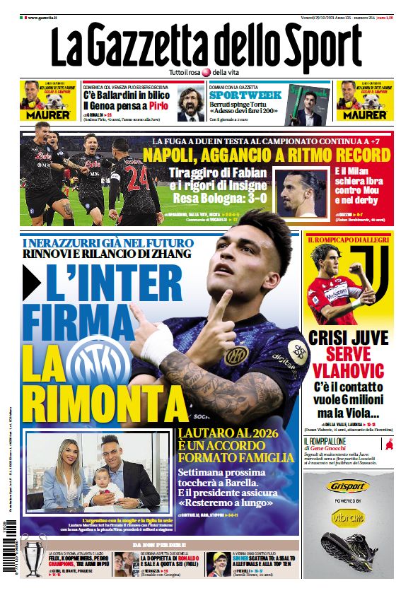 سلطت لا جازيتا الضوء في غلافها على تمديد عقد لاوتارو مع إنتر، وذلك تحت عنوان "انتر.. التوقيع على العودة.. النيرازوري بالفعل في المستقبل، تجديد إعادة الإطلاق بواسطة تشانج".