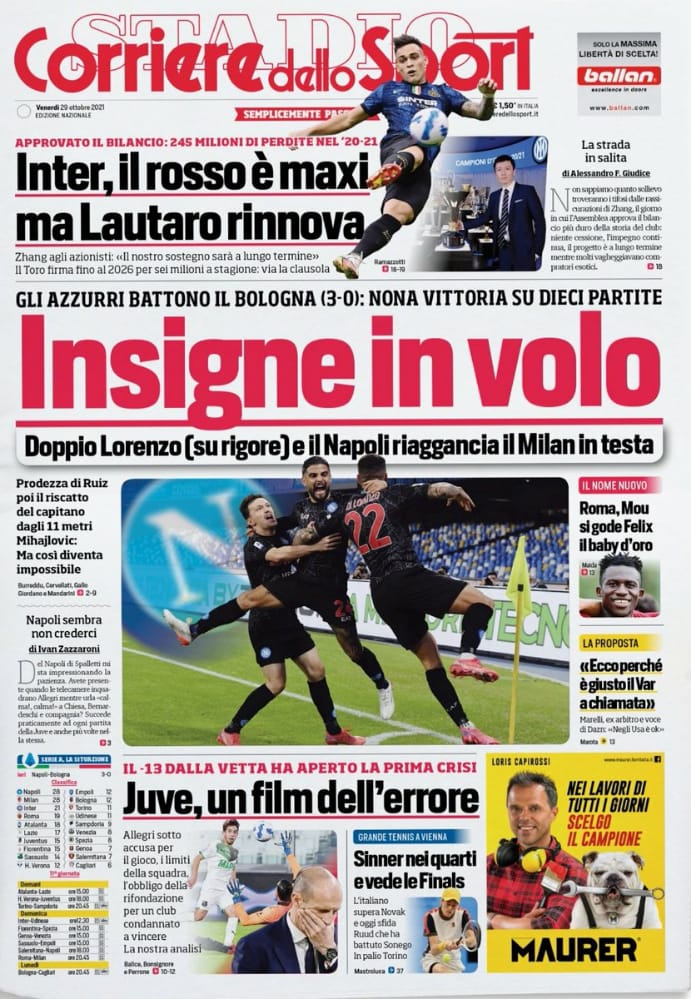 اهتمت الصحيفة بالحديث عن فوز فريق نابولي على بولونيا، وذلك تحت عنوان "إنسيني يطير.. فاز الأزوري على بولونيا 3-0.. فوز تاسع في 10 مباريات".