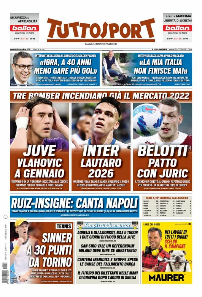 عنونت صحيفة توتو سبورت الإيطالية في غلافها بالعنوان "ثلاثة هدافين يضيئون السوق في عام 2022.. يوفنتوس، فلاهوفيتش في يناير"، وذلك مع ذكر تمديد عقد لاوتارو مع انترحتى 2026.