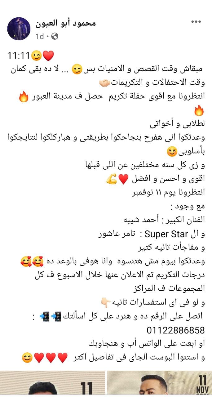 نشر محمود أبو العيون، معلم لمادة التاريخ بمدينة العبور بالقاهرة على صفحته الخاصة عبر موقع التواصل الاجتماعي فيس بوك إعلانا بشأن تنظيم حفلة لتكريم طلاب الثانوية العامة بحضور الفنان تامر عاشور، والفنان أحمد شيبة.