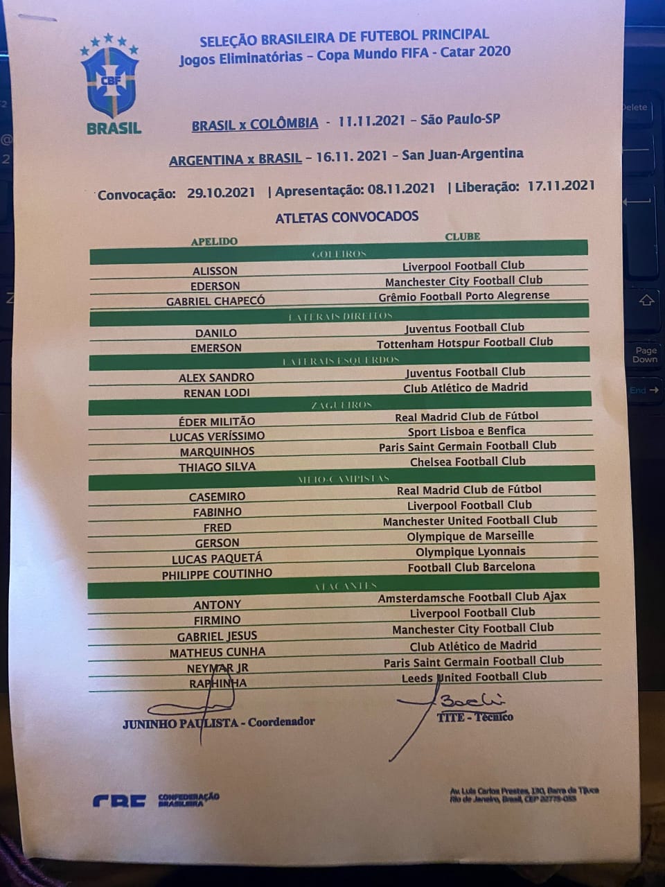 وشهدت القائمة ضم جابرييل تشابيكو، حارس مرمى جريميو وهو اللاعب المحلي الوحيد المدعو من قبل تيتي، لمباراتي المنتخب البرازيلي ضد كولومبيا والأرجنتين في تصفيات كأس العالم.
