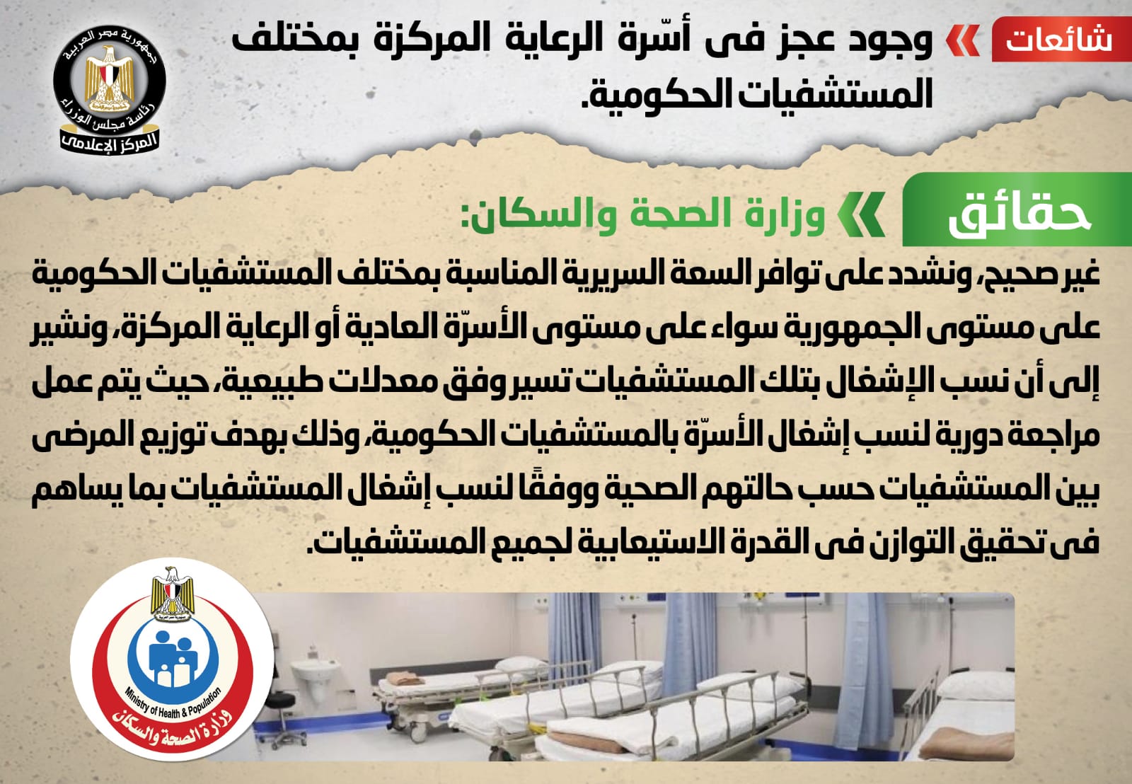 وزارة الصحة والسكان، أكدت أنه لا صحة لوجود عجز في أسّرة الرعاية المركزة بمختلف المستشفيات الحكومية، مُشددةً على توفر السعة السريرية المناسبة بمختلف المستشفيات الحكومية على مستوى الجمهورية سواء على مستوى الأسرّة العادية أو الرعاية المركزة، مُشيرةً إلى أن نسب الإشغال بتلك المستشفيات تسير وفق معدلات طبيعية، حيث يتم عمل مراجعة دورية لنسب إشغال الأسرّة بالمستشفيات الحكومية، وذلك بهدف توزيع المرضى بين المستشفيات حسب حالتهم الصحية ووفقًا لنسب إشغال المستشفيات بما يسهم في تحقيق التوازن في القدرة الاستيعابية لجميع المستشفيات.