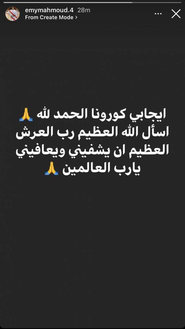 وكتبت زوجة مدافع الزمالك عبر صفحتها الشخصية على موقع التواصل الاجتماعي «إنستجرام»: إيجابي كورونا الحمد لله اسأل الله العظيم رب العرش العظيم أن يشفيني ويعافيني يا رب العالمين.